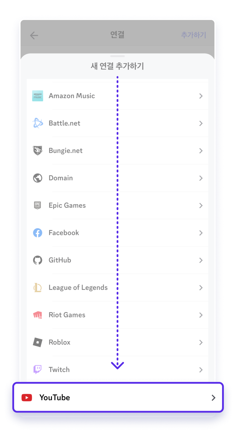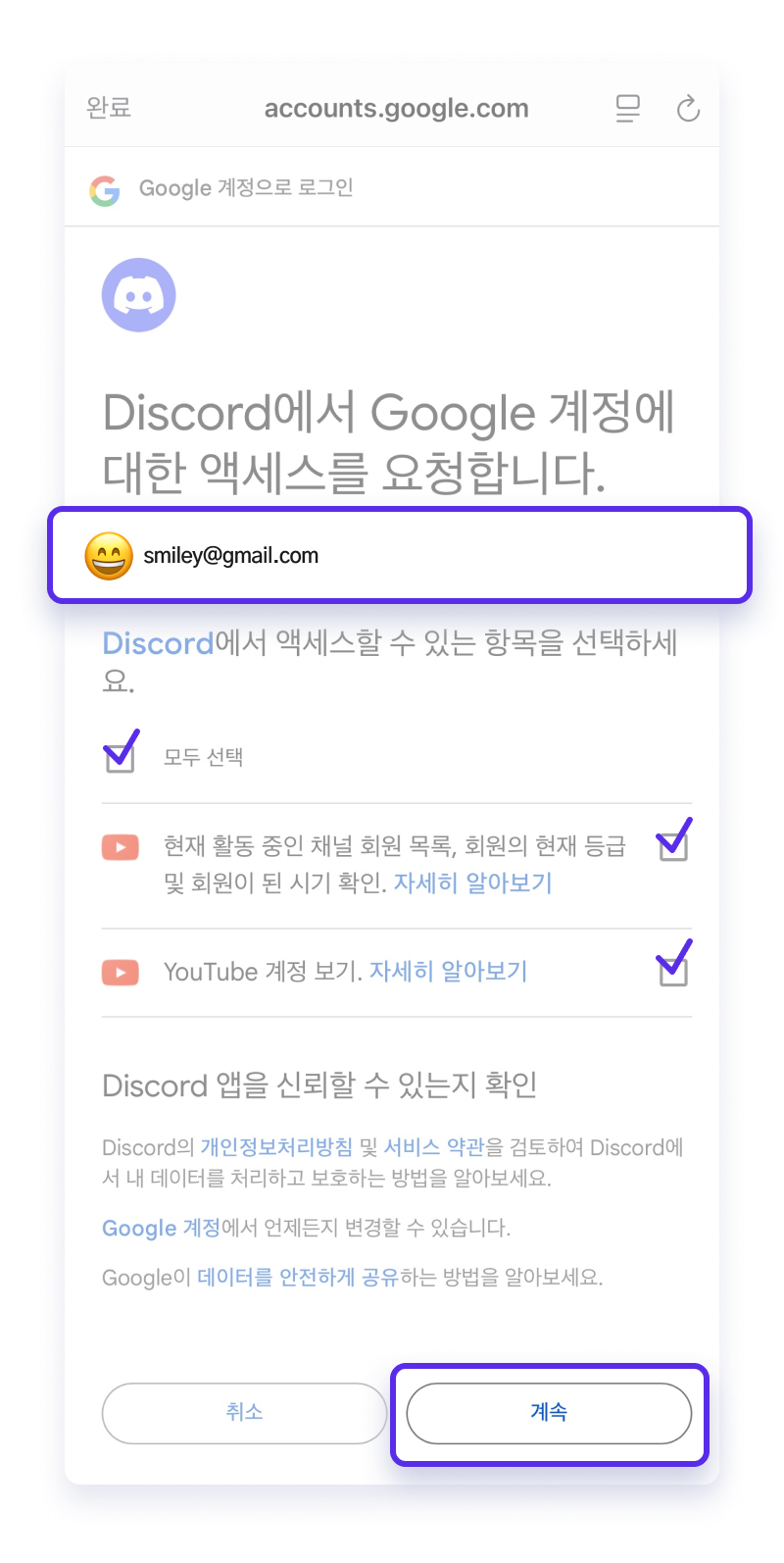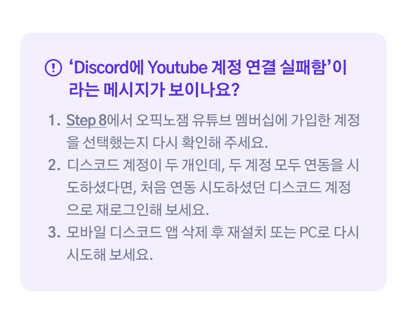 초대를 수락한 후, 다시 이화면으로 돌아와 유튜브와 디스코드 연동을 진행해 주세요.